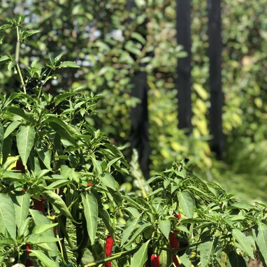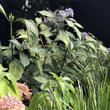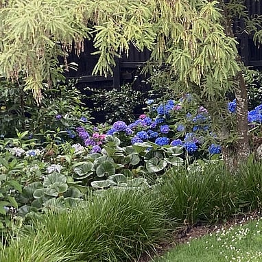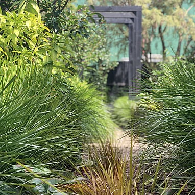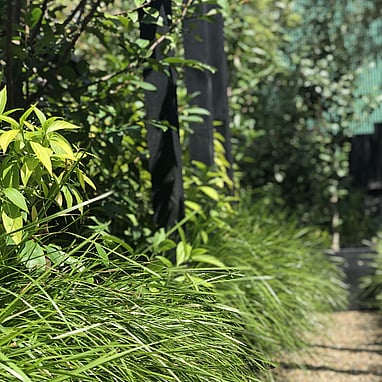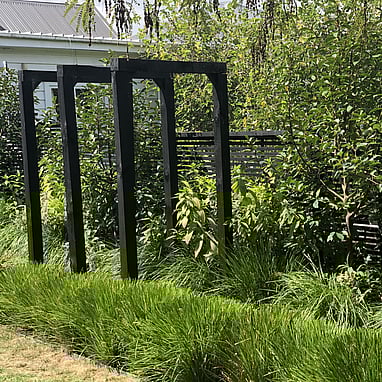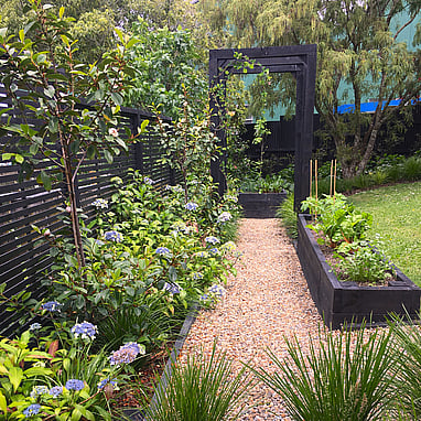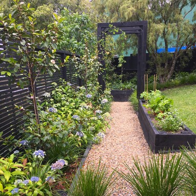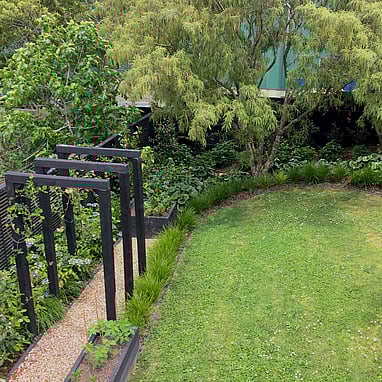 Mass planting of ligularia and hydrangea fill the large voids at the rear of the garden under the shade from the kowhai, whilst at the side are michelia and dichroa for flowers throughout the year. The whole garden is softened with edging of ornamental grasses. We created a gravel path with two raised beds for the client to grow edibles and a statement arch to provide vertical form as the garden is mostly looked at from above.